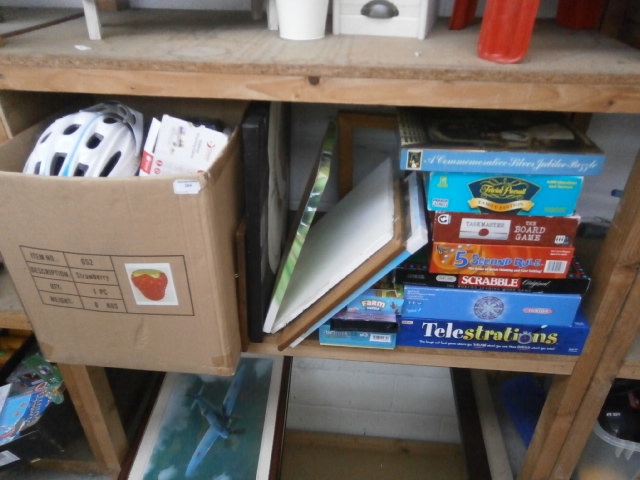 A white bicycle helmet with blue accents is presented alongside a collection of board games including A Commemorative Silver Jubilee Jigsaw, Total Planet, TAIRMASTERS, 5 Second Rule, SCRABBLE Original, and Telestrations.