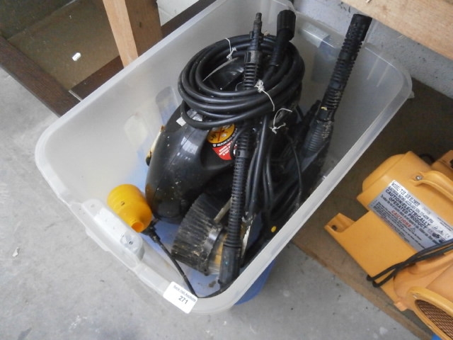 This lot contains a black pressure washer with hoses and spray wand, along with a yellow air blower.