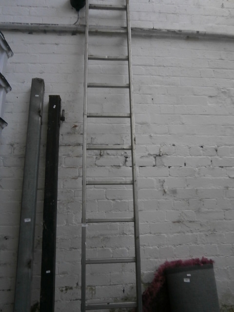A metal straight ladder with multiple rungs, showing signs of wear.