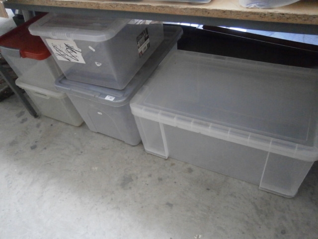 This lot contains three clear plastic storage bins with hinged lids in clear, grey, and red.