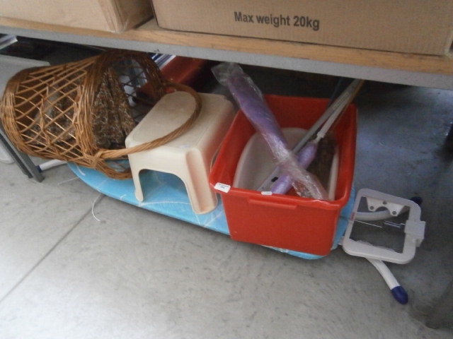 A collection of household cleaning tools including a brush, dustpan, and cleaning bin, presented in a wicker basket alongside a plastic stool and cleaning tool frame, all situated on an ironing board.