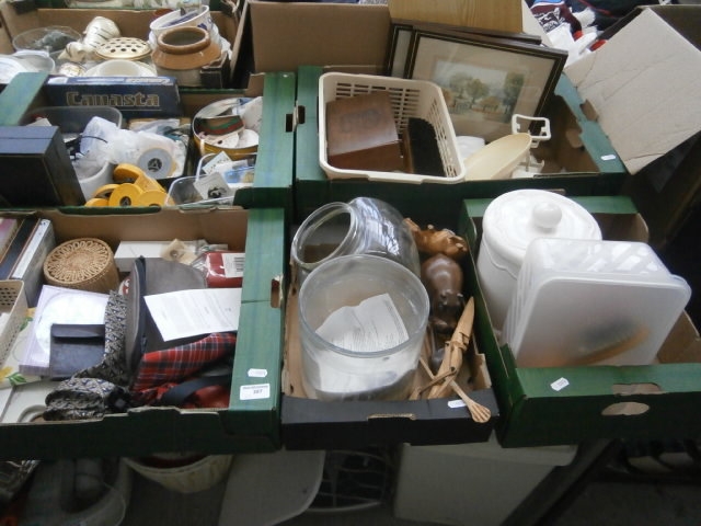 Collection of ceramics, glassware, wooden items, textiles, and various other household objects contained within green plastic crates and cardboard boxes.