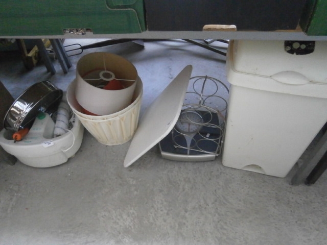 A white plastic foot bath with accessories, two lampshades, a metal wine rack, and a white plastic bin.