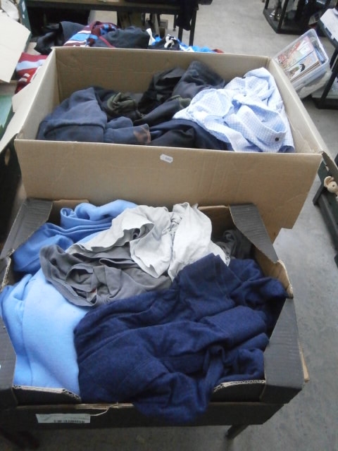 This lot contains two containers filled with various clothing items in multiple colors.