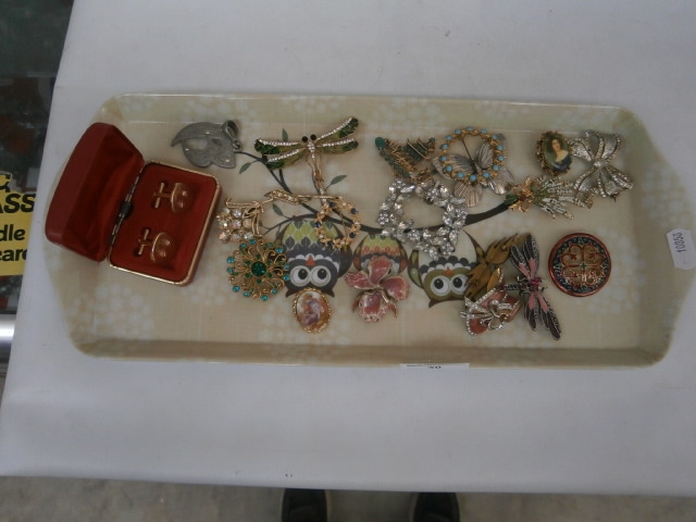 A collection of assorted brooches and a pair of earrings displayed on a patterned tray.