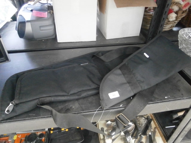 This is a black fabric case with a curved, elongated shape, featuring a zippered closure and an adjustable fabric strap.