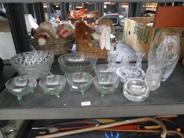 This lot features a collection of glass and crystal tableware, two woven baskets with stuffed toys, a branded cardboard box, and several wooden walking sticks.