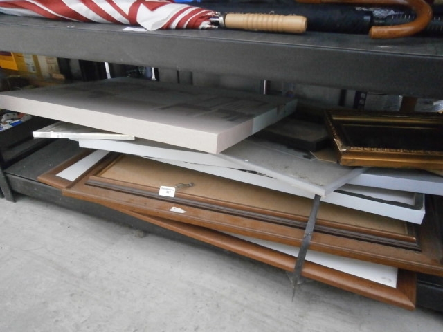 This lot contains several framed pictures, a striped umbrella, and various flat panels.
