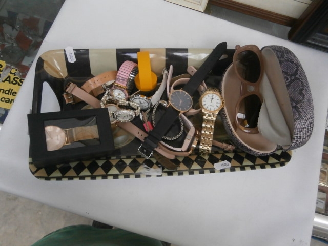 A patterned tray containing multiple watches with various bands and faces, a pair of sunglasses in a snakeskin case, and a yellow accessory.