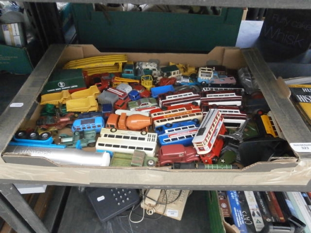 This lot features a collection of toy vehicles including multiple double-decker buses, a cement mixer, and various trucks.