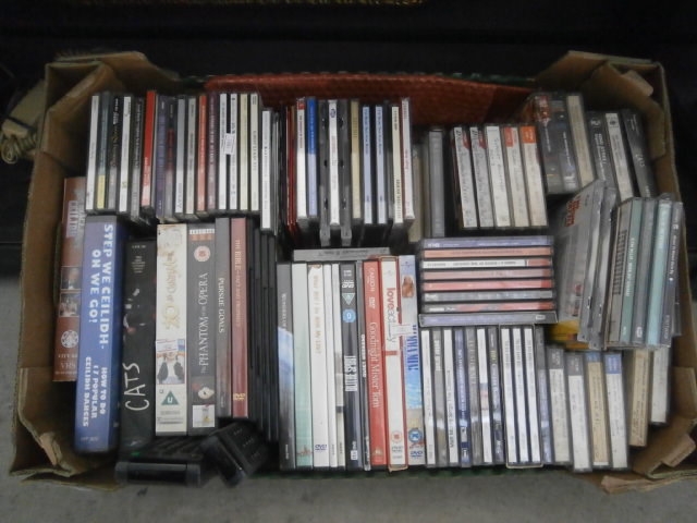 This lot contains a collection of various DVDs and CDs in plastic cases, housed within a cardboard box.