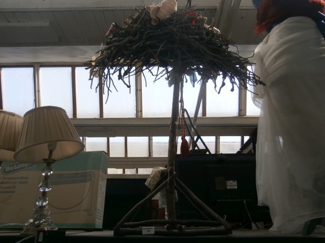 A floor lamp featuring a natural branch tripod base and pole, topped with a fabric shade adorned with a twig “nest” and red tassels.
