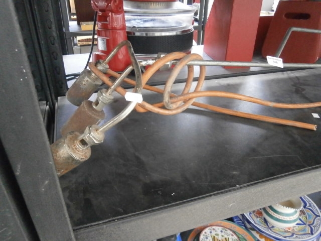 A metal rod is coiled with an orange hose and features two cylindrical metal components attached by curved tubes.