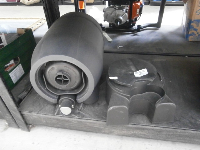 Two dark gray plastic items, one cylindrical with a metal component and knob, the other contoured with a sticker.