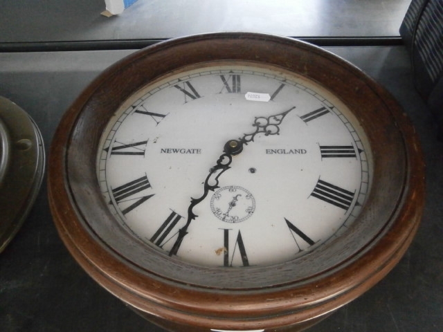 A round Newgate clock with a wooden bezel, white face, black Roman numerals, and a sub-dial.
