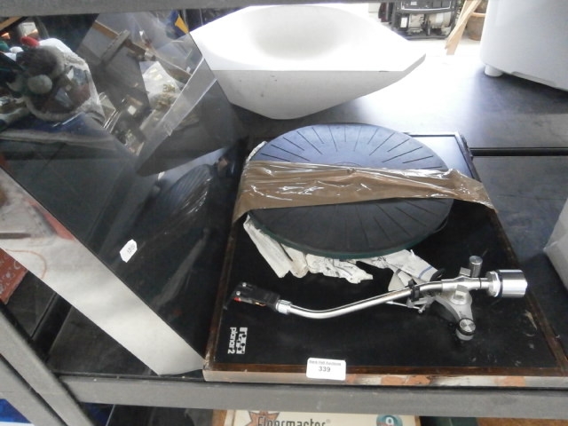 This is a Rega Planar 2 turntable with a black base and silver tonearm.