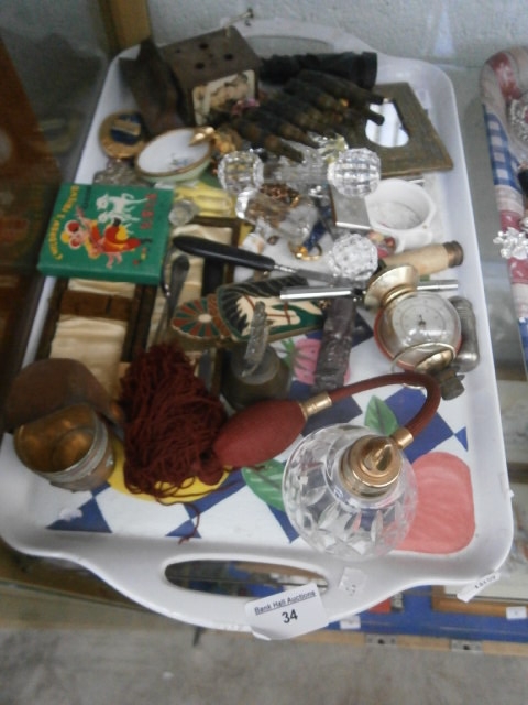 A white plastic tray containing a collection of assorted decorative objects including a glass atomizer, metal containers, glass knobs, a medal, a mirror, and a spoon.