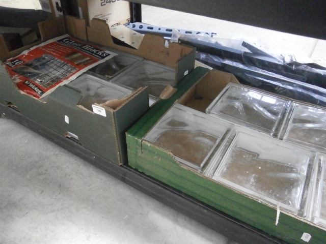 Multiple clear glass blocks with textured interiors, presented in original Wickes branded and plain cardboard packaging.