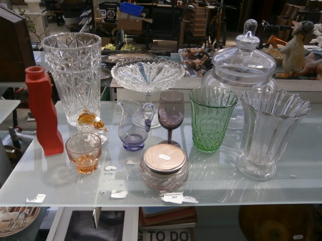 This collection features a variety of glass and ceramic decorative items, including vases, a jar with a lid, a bowl, a cup, and a figurine.