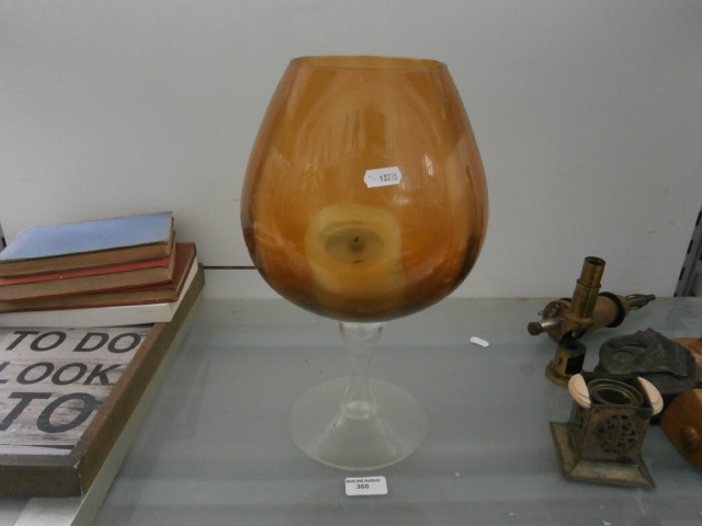 A large, amber-colored glass vase with a rounded bowl, tapering to a clear glass stem and base.
