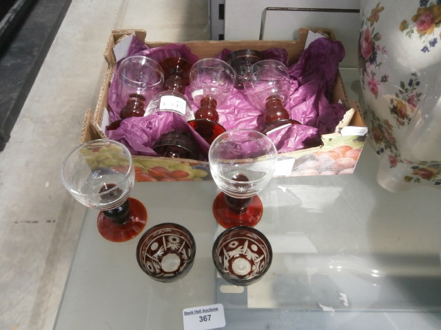 This lot features six stemmed glasses with etched clear bowls and dark red stems, alongside two dark red bowls with etched white patterns.