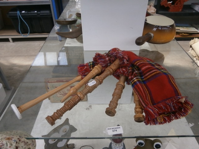 A set of bagpipes featuring a red tartan bag and multiple wooden pipes with carved detailing.