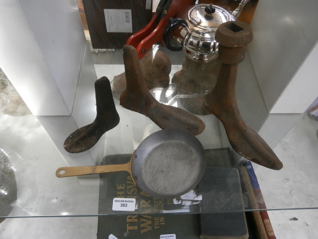 This lot features three cast iron shoe lasts of varying sizes and a shallow metal pan with a brass-colored handle.