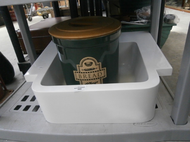 A green cylindrical container with a rounded lid, designed for bread, is housed within a white plastic bin.
