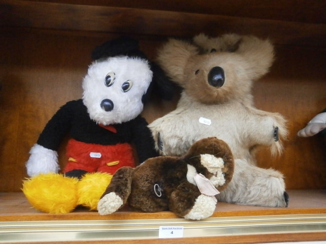 This lot features three plush toys, including a Mickey Mouse character, a koala, and a brown dog with a wind-up key.