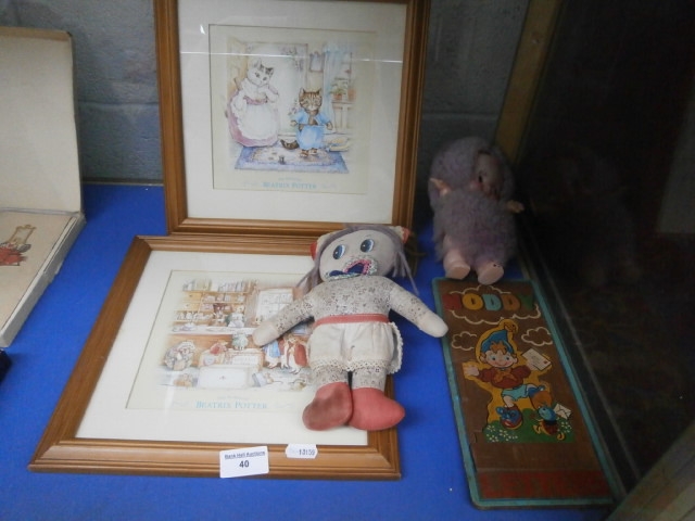 This lot includes two Beatrix Potter prints, a Noddy wooden board, a fabric doll, and a purple stuffed toy.