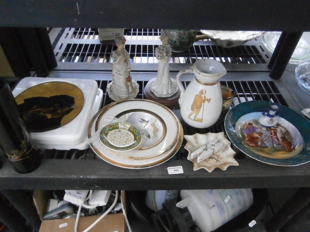 A white ceramic pitcher with gold trim and a painted figure is displayed with several plates, dishes, and a vase.