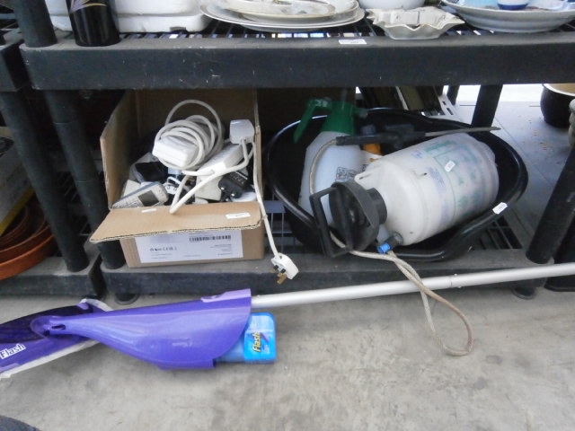 A purple and silver telescopic mop with a blue “Flash” cleaning solution bottle.