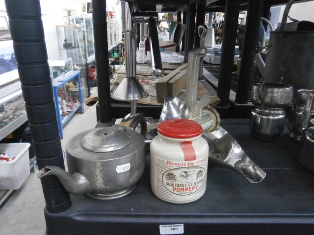 A hammered metal teapot with a glass mustard jar.