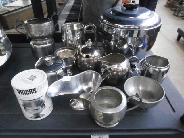 This lot features a collection of metal serving pieces including a large lidded warmer, pitchers, bowls, and a gravy boat.