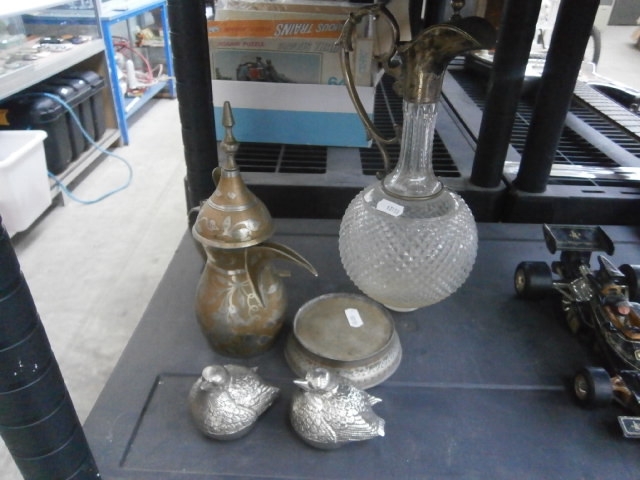 This lot features a decorative metal pot with floral inlay, a lidded metal container, a cut glass decanter with metal accents, and two metal duck figurines.