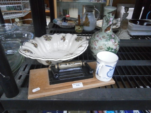 A ceramic shell-shaped dish with a floral pattern and black rim, mounted on a metal mechanism with rollers and a wooden base, accompanied by a ceramic mug.