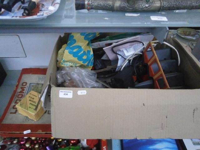 A cardboard box containing assorted items including 3D glasses and electronic components, alongside a separate box for a “LODOMO P.A.W. MODEL ENGINE”.