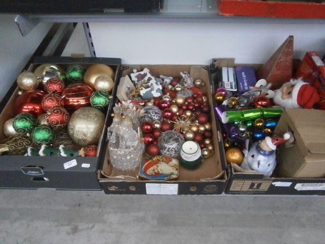 This collection features a variety of Christmas ornaments in red, green, gold, and blue, including round, star-shaped, and textured designs, along with a ceramic snowman and plush Santa figure.