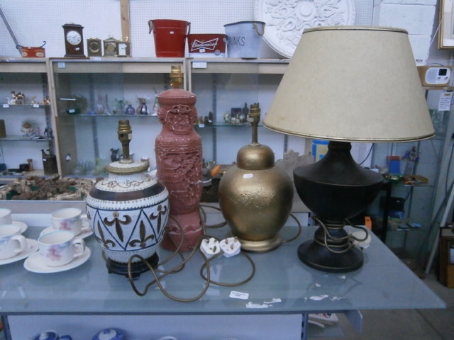 This lot features three table lamps with ceramic and metal bases, each with a unique decorative style.