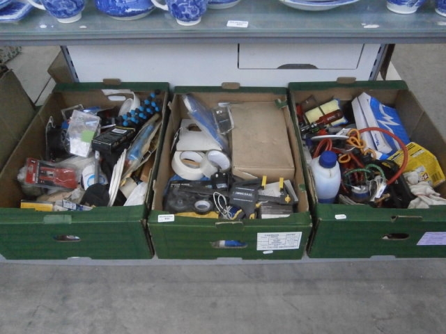 Three green plastic crates containing a variety of tools, electronic components, wires, tape, and packaged items.