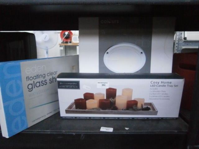 A boxed set containing a wooden plate, LED candles in red and white, and decorative accessories.