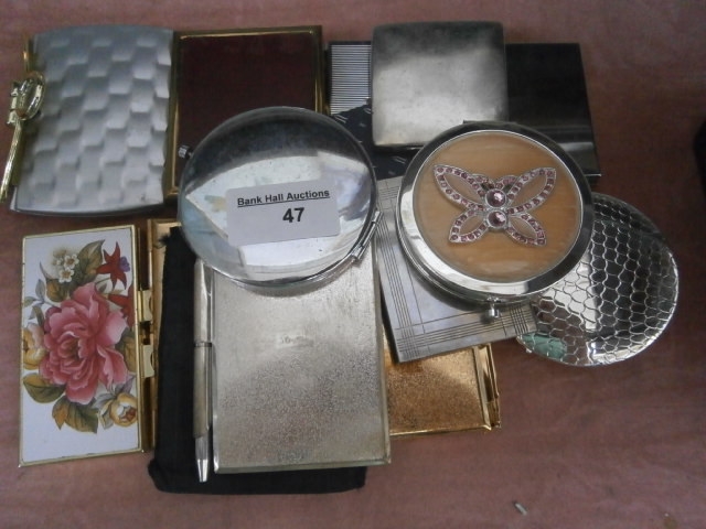 This lot features several decorative cases, a compact with stone embellishments, and a glass sphere.