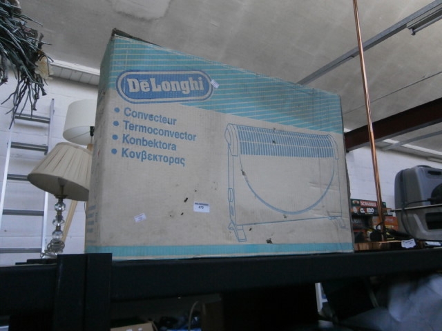This is a cardboard box for a DeLonghi convector heater, featuring product details and branding.