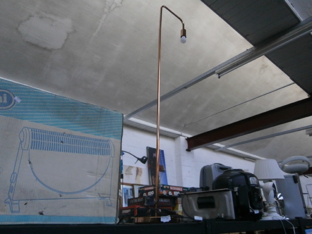 This is a floor lamp featuring a thin, copper-colored pole that curves upwards to hold a single bare light bulb, supported by a dark base.