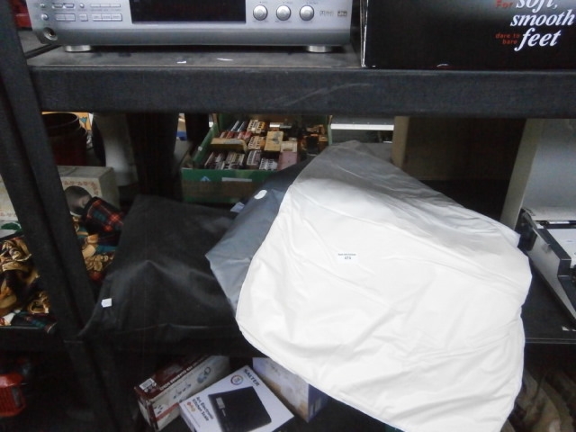 This lot contains a large, irregularly shaped object encased in a sealed white plastic bag, alongside a dark grey or black fabric item.