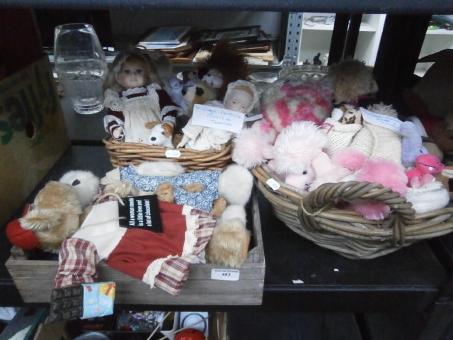 This lot features a collection of stuffed toys, a doll with accessories, and a novelty garment.