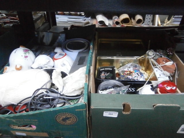 Two green boxes containing a floral ceramic teapot, a ceramic vessel, yarn, an electrical cord, a metal tin with beads, a Jack Daniel’s tin, a round tin, and a M&M figurine.