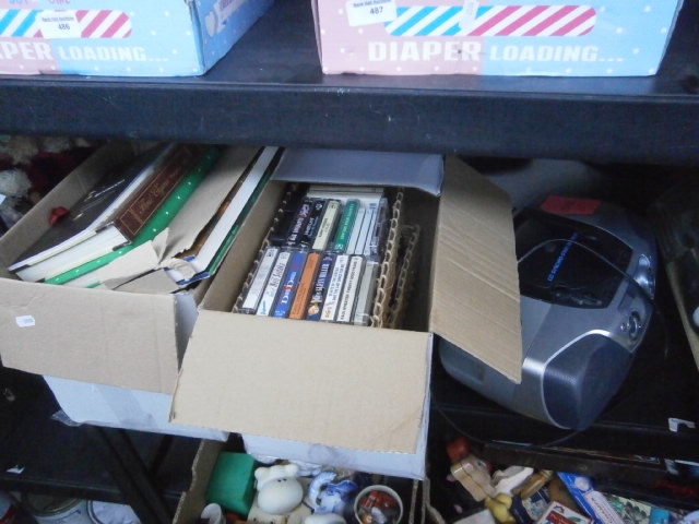 This lot features a collection of audio cassettes and books, alongside a portable CD stereo system.