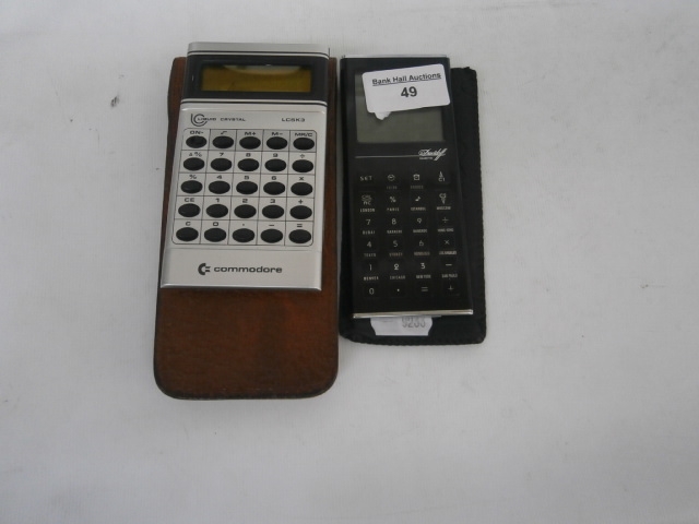 Two calculators, one a silver-tone Commodore LC5K3 with a leather case, and the other a black Davidoff calculator with city-named buttons.
