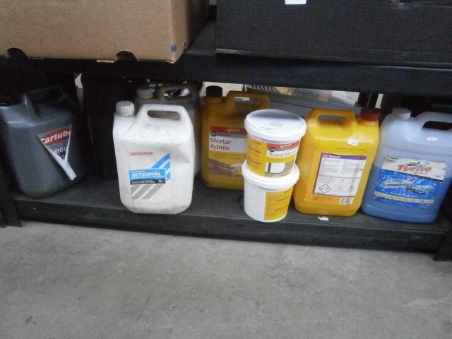 A collection of various plastic containers holding liquid products, including jerrycans and jugs.